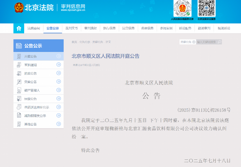 然而,这位董事长却已经起诉北京汇源,要求法院确认公司某项决议的效力。北京市顺义区人民法院开庭公告显示,该院定于2025年9月15日下午14时整,在北京法院云法庭依法公开开庭审理鞠新艳与北京汇源食品饮料有限公司的公司决议效力确认纠纷一案。其中,原告为鞠新艳,被告为北京汇源。